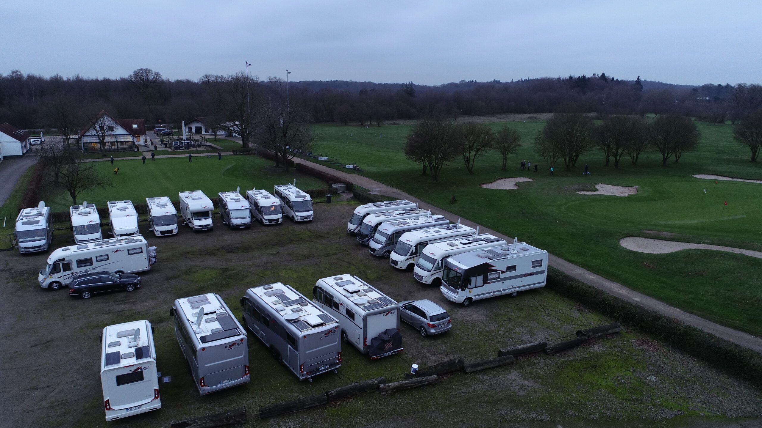 Sie stehen mit Ihrem Wohnmobil in unmittelbarer Nähe zum Clubhaus/MoyLounge und blicken auf Putting Grün und Driving Range und in die schöne Landschaft des Niederrheins.